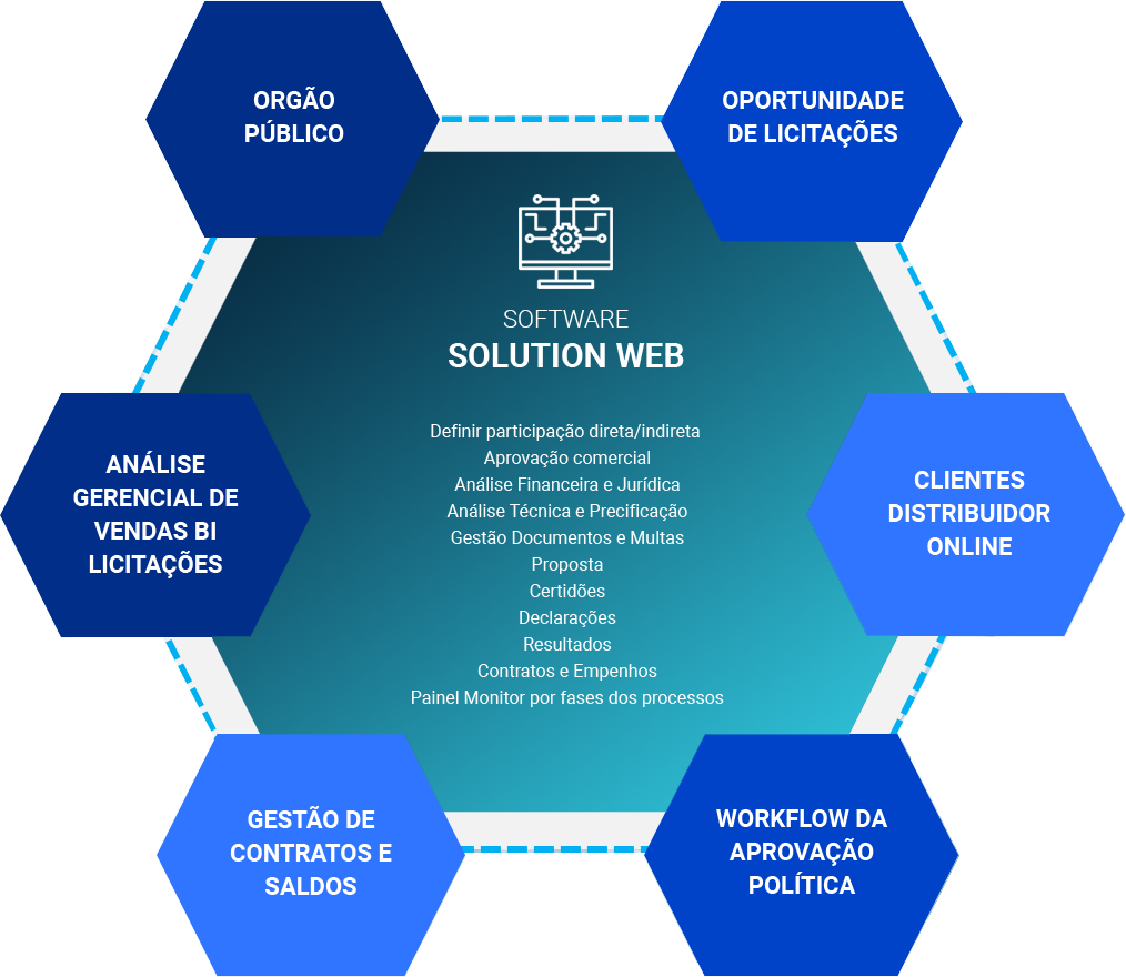 Solution Enterprise é uma poderosa solução de gestão de todos os processos licitatórios, o software possibilita com seus diversos módulos a gestão de licitações diretas e indiretas via distribuidores, todo o fluxo de aprovação através do WorkFlow que é um software que integra o sistema de gestão de licitações Solution, mantendo o gerenciamento das aprovações das licitações, contendo três macro fluxos de aprovações: Fluxo de Política Comercial, Crédito e Cobrança e por Alçada de Valor.